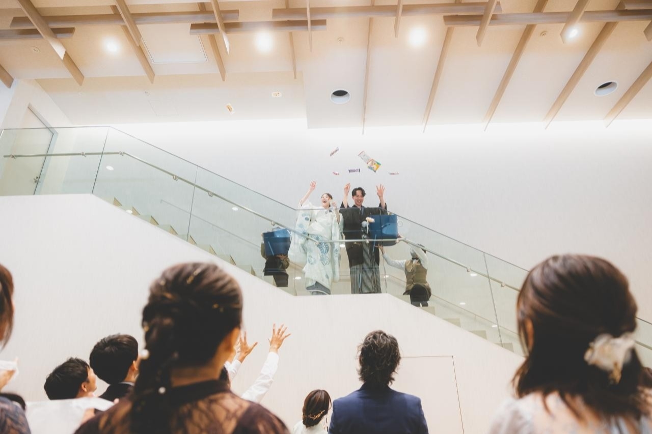 お開き後、おふたりが階段からサプライズ登場!